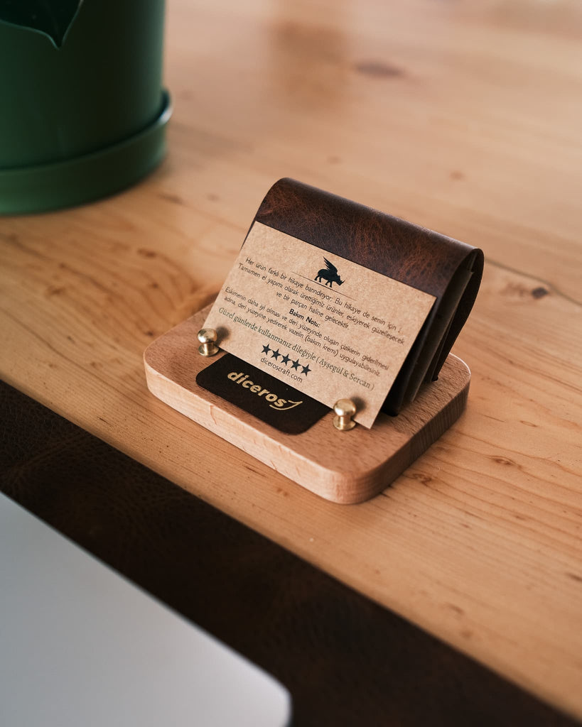 Masif Ahşap Kartvizit Standı: Profesyonel sunum ve kolay erişim.